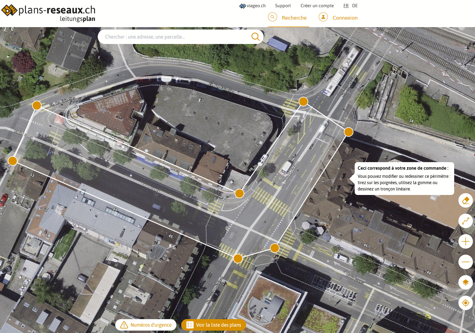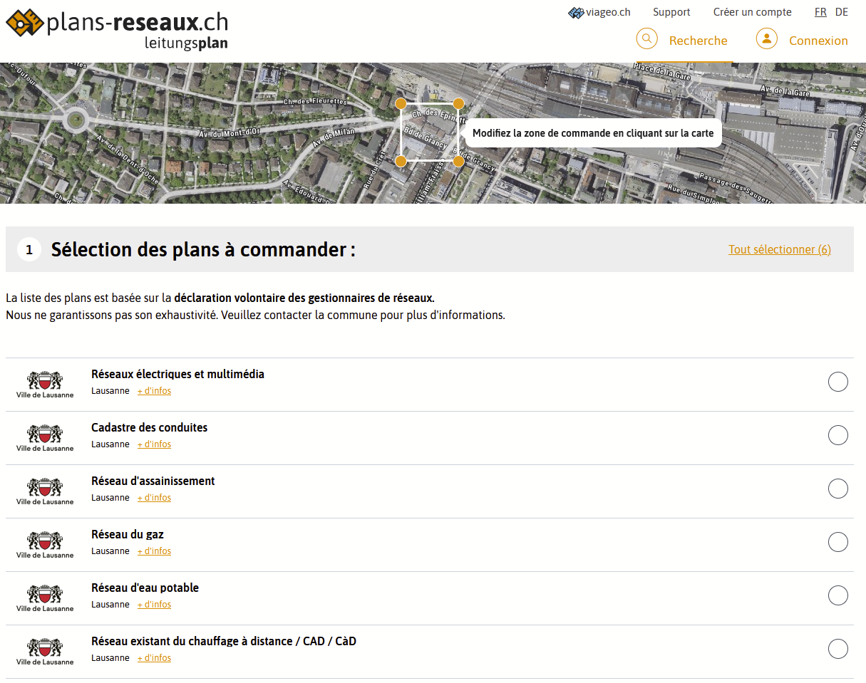 - La page "sélection de plans à commander" : https://plans-reseaux.ch/result