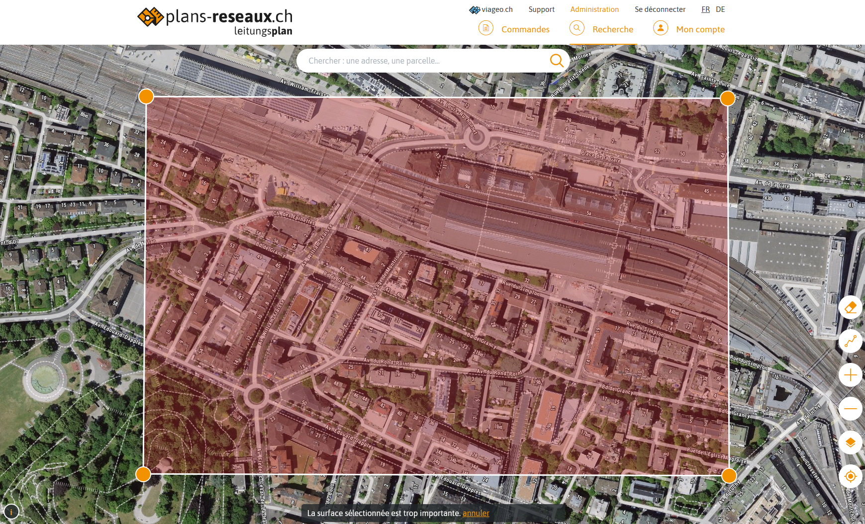 - Si le périmètre est trop grand (> 0.2 km2) : le paramètre showList est ignoré (la valeur par défaut false est utilisée), l'utilisateur est renvoyé vers la carte avec la zone à commander en rouge et le texte "La surface sélectionnée est trop importante."